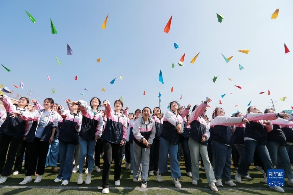 5月31日,在淮北市第十二中學(xué),高三學(xué)生在操場上扔紙飛機(jī)。