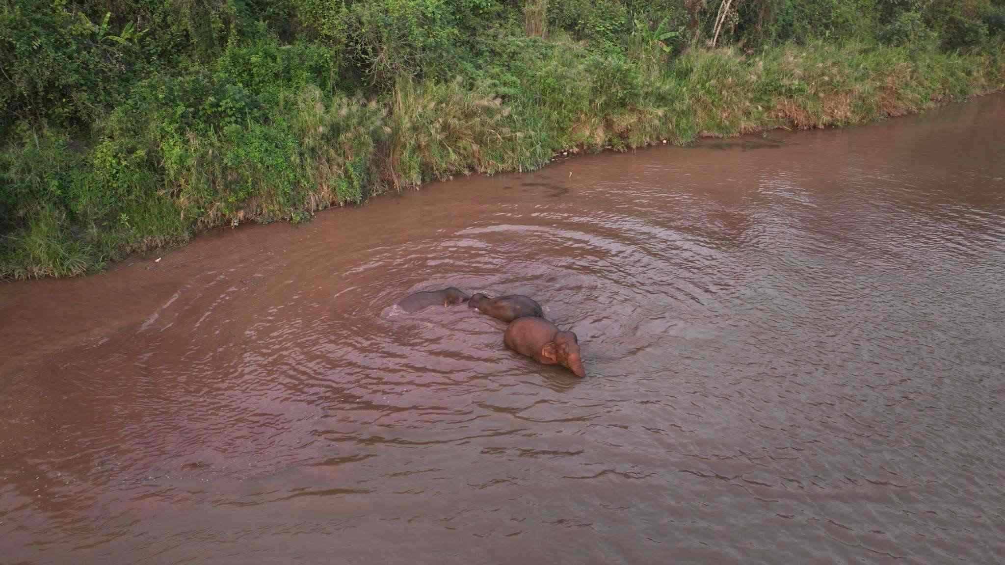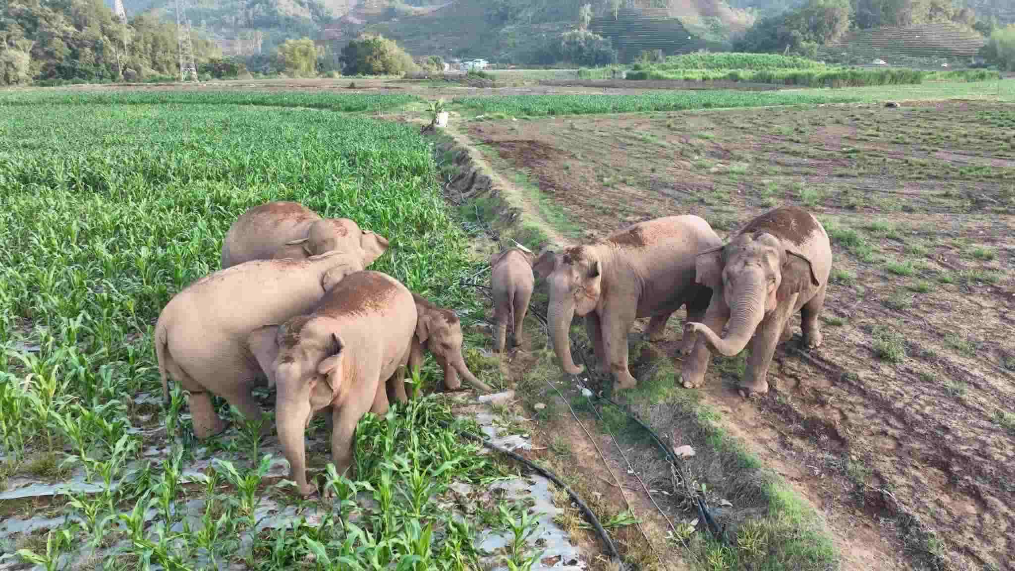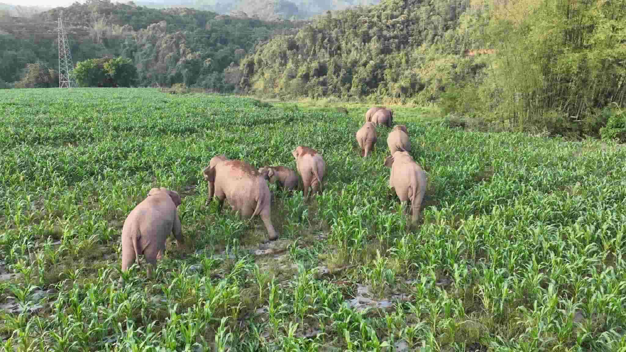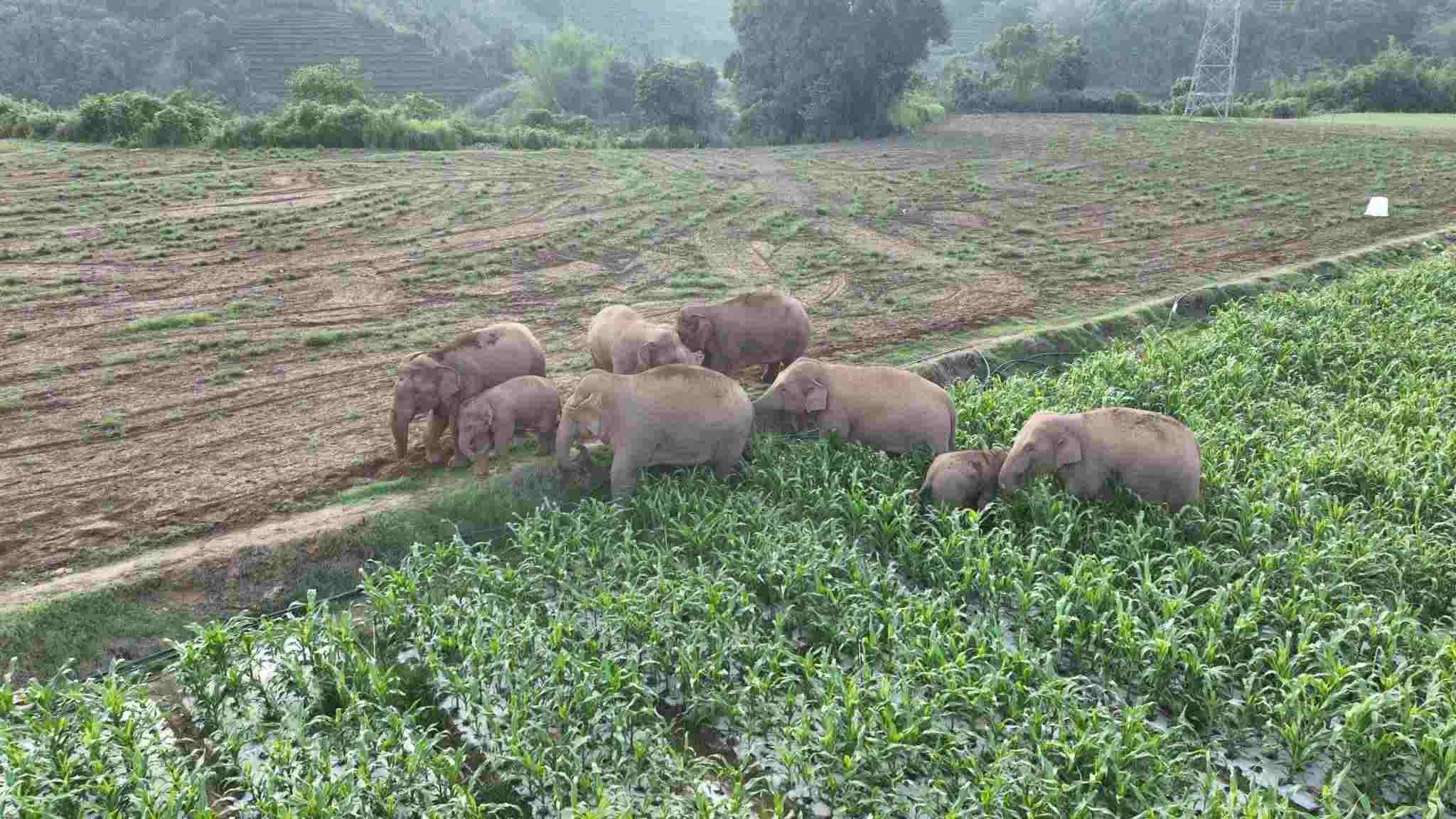 2023年5月17日,云南普洱,亞洲象群出山覓食戲水。視覺中國(guó)