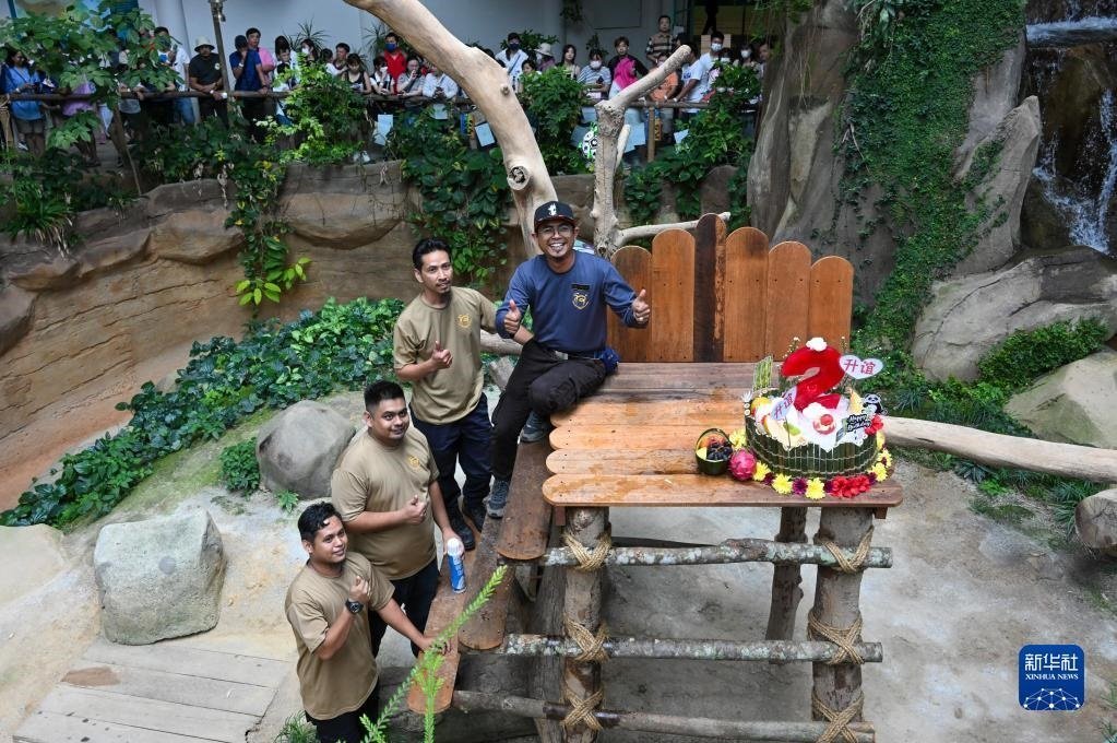 5月31日,在馬來西亞吉隆坡附近的馬來西亞國家動物園,大熊貓飼養(yǎng)員阿克邁勒(右)和他的團(tuán)隊與“升誼”的生日蛋糕合影。