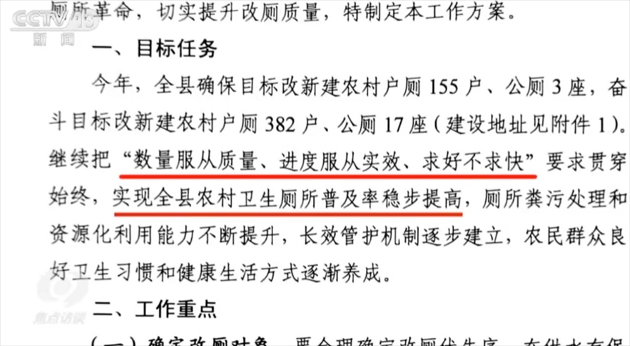 央視網(wǎng)消息(焦點訪談):“小廁所、大民生”。廁所問題不僅關系農(nóng)村人居環(huán)境的改善,也關系廣大人民群眾生活品質(zhì)的提升。目前,全國農(nóng)村衛(wèi)生廁所普及率超過73%,“廁所革命”走向縱深。然而,記者在調(diào)查中發(fā)現(xiàn),有些地區(qū)的廁改成績很“亮眼”,廁改成效卻很“扎眼”,這關乎百姓切身利益的大事兒,要經(jīng)得起“回頭看”、再檢驗。