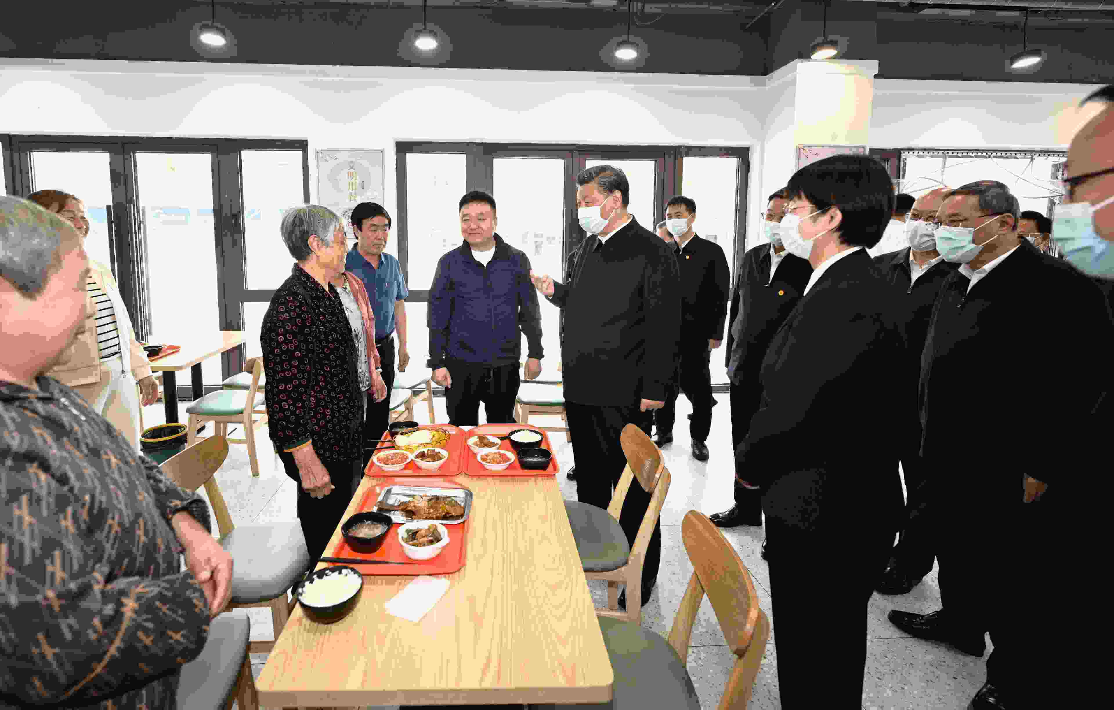 △5月10日,習(xí)近平總書記在河北省雄安新區(qū)考察,并主持召開高標準高質(zhì)量推進雄安新區(qū)建設(shè)座談會。這是10日上午,習(xí)近平在容東片區(qū)南文營社區(qū)食堂同就餐的社區(qū)老人親切交流。