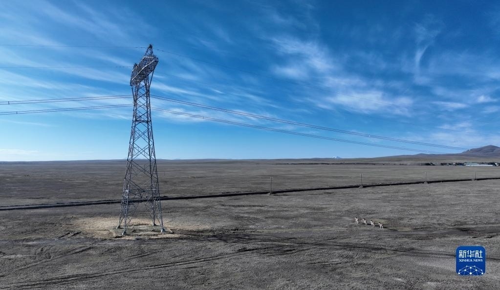 6月4日, 在青海省海西蒙古族藏族自治州格爾木市唐古拉山鎮(zhèn)境內(nèi),幾只藏野驢從青藏聯(lián)網(wǎng)工程輸電鐵塔前經(jīng)過(無人機照片)。