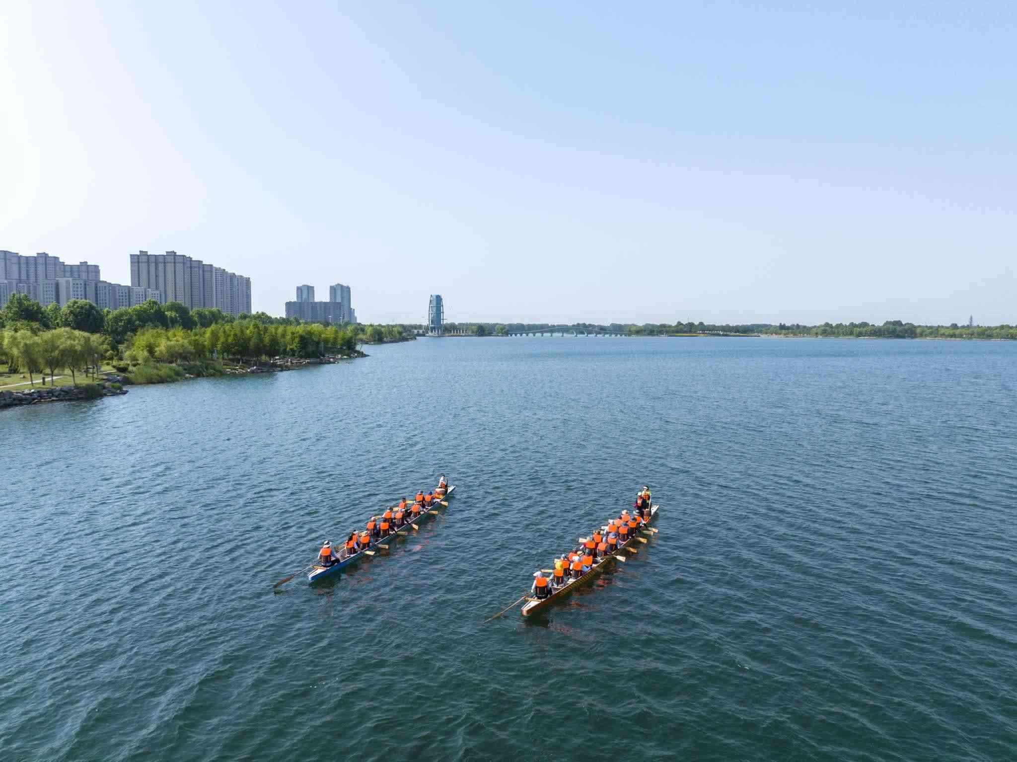 2023年6月8日,江蘇連云港,東海縣西雙湖風景區(qū),多支龍舟隊在西雙湖水域進行訓練,積極備戰(zhàn)端午龍舟賽。視覺中國