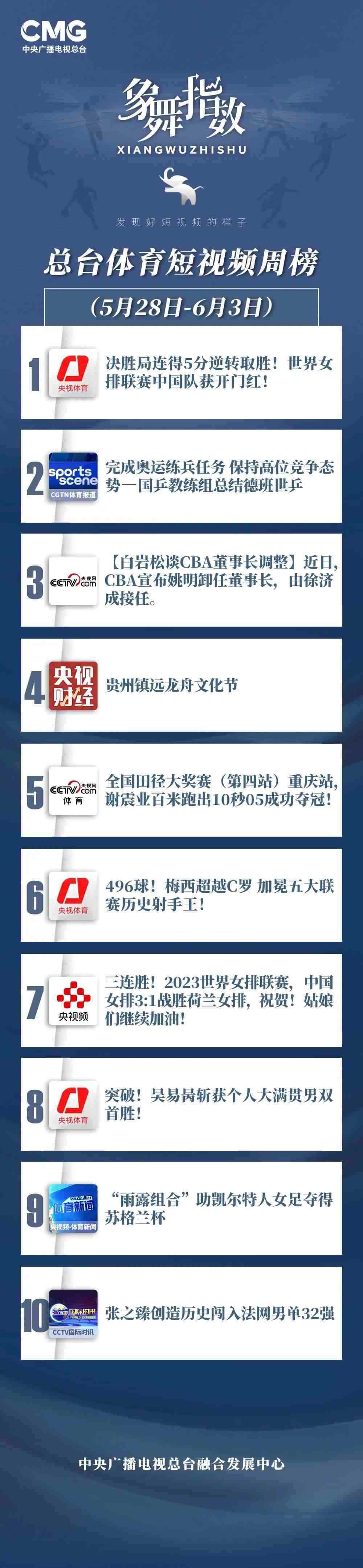 中央廣播電視總臺“象舞指數(shù)”評議品牌,推出體育短視頻周榜、總臺體育短視頻周榜。在5月28日—6月3日,以下內(nèi)容獲得矚目: