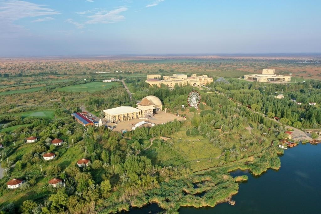這是內(nèi)蒙古鄂爾多斯市庫布其沙漠腹地的七星湖景區(qū)(2021年7月17日攝,無人機照片)。新華社記者 金良快 攝