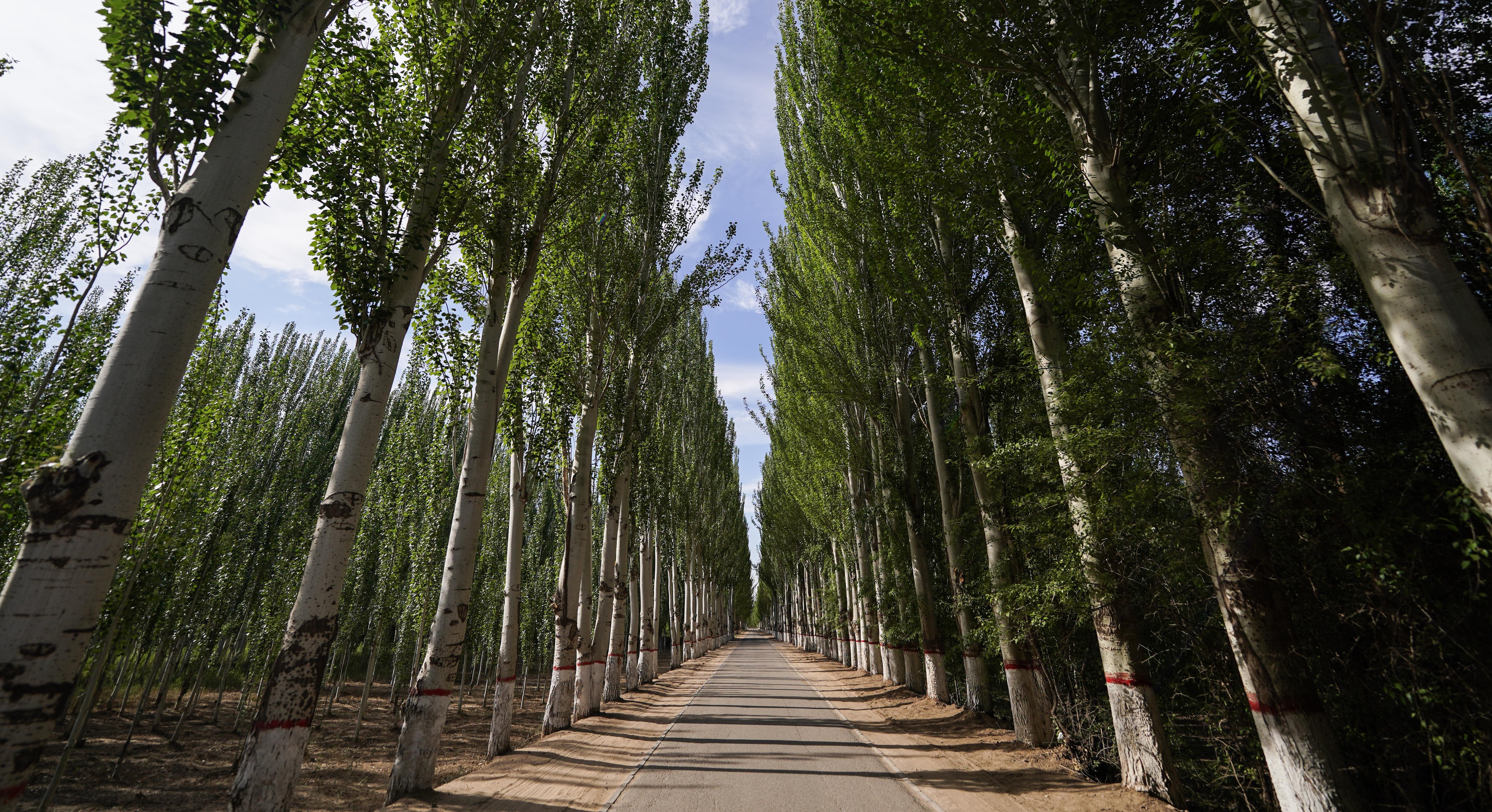 △內(nèi)蒙古巴彥淖爾市臨河區(qū)國(guó)營(yíng)新華林場(chǎng)的防護(hù)林(總臺(tái)國(guó)廣記者李晉拍攝)