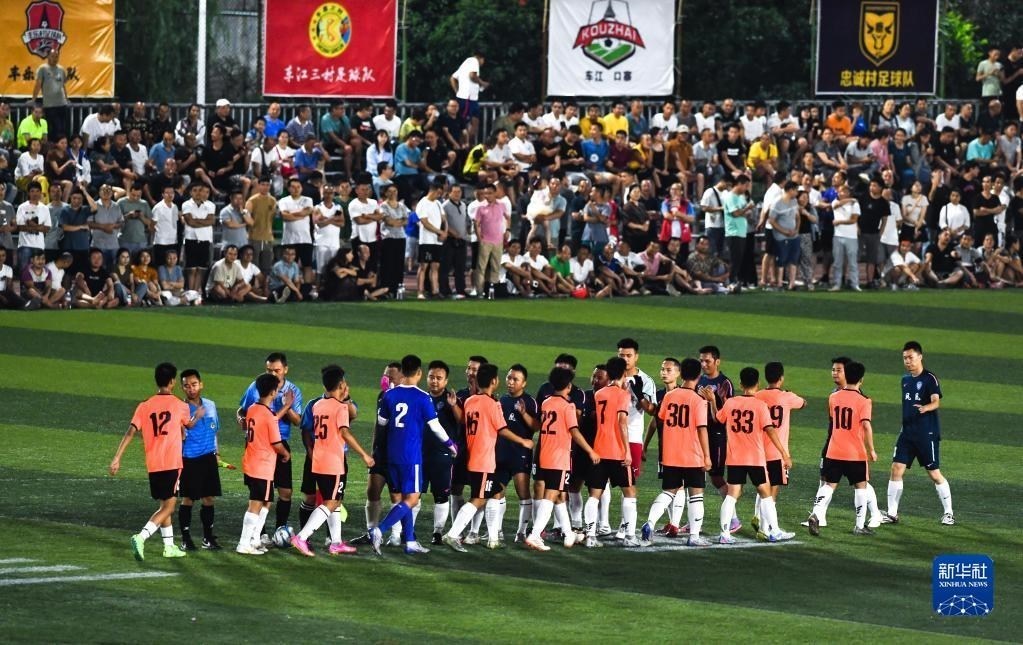 6月9日,鳳凰村足球隊與新中村足球隊在比賽結(jié)束后相互擊掌致意。