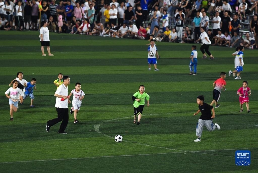 6月9日,小朋友們在貴州“村超”足球比賽半場休息時間上場踢球。