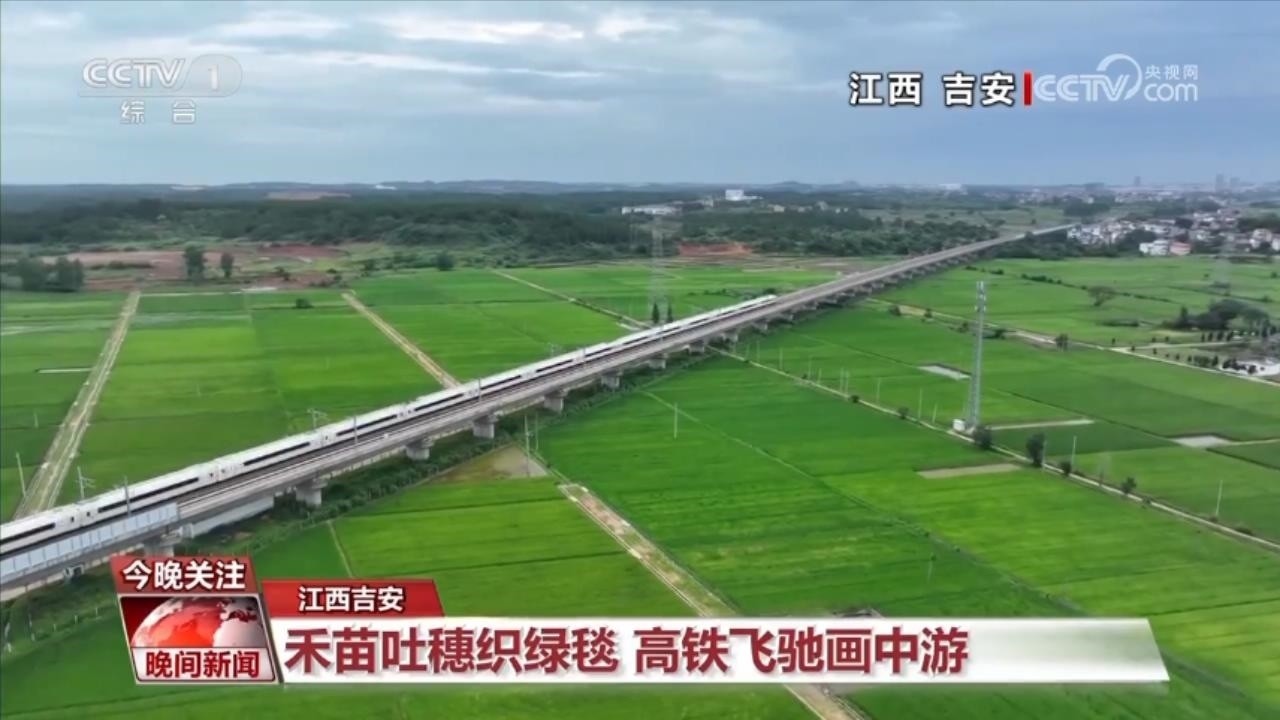 跟隨疾馳的高鐵,飛至江西吉安這片稻田的上空。早早種下的水稻,已經(jīng)進入抽穗期。飛馳的高鐵從一塊塊綠毯中呼嘯而過,驚起層層稻浪。這是工業(yè)與農(nóng)業(yè)的交響,這是快與慢的彼此致敬。再過二十多天,這片綠色的田野,將回饋黃澄澄、沉甸甸的稻谷。