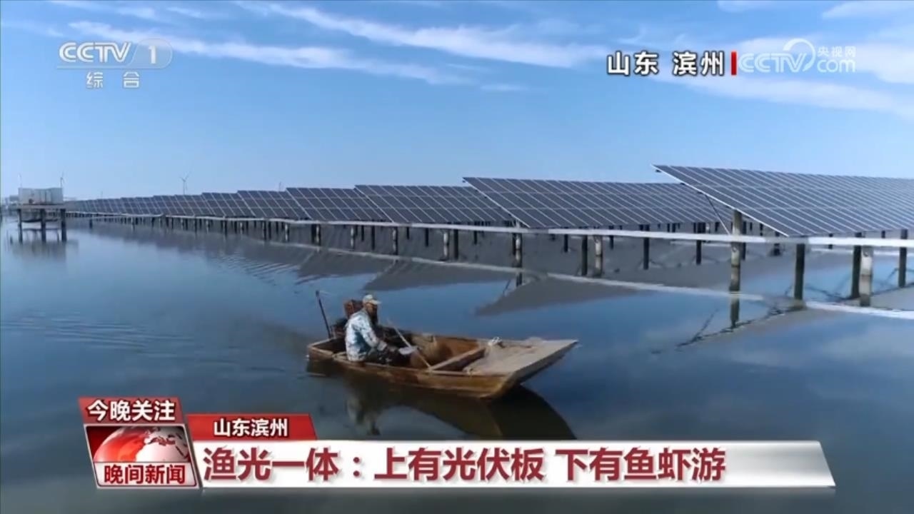 我們現(xiàn)在從陸地轉(zhuǎn)向水域,在山東濱州沾化的這個鹽田蝦養(yǎng)殖區(qū)里,蝦池上方是藍色光伏板,25度傾斜角的設計,既能達到最佳發(fā)電效果,又能為蝦池遮光、降溫。光伏矩陣下,漁民撐一葉小舟為蝦苗投喂餌料。每年,2000萬尾鹽田蝦從這里游上全國餐桌,近4億度清潔綠電并入電網(wǎng)。養(yǎng)殖業(yè)牽手新能源,奏出新時代的漁光曲。