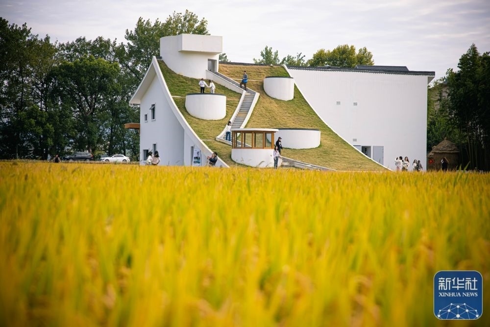 這是浙江杭州市桐廬縣桐君街道梅蓉村金黃的稻田與鄉(xiāng)村會客廳(2022年10月25日攝)。新華社記者 江漢 攝