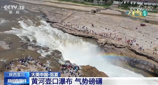 這是從陜西延安宜川縣拍攝到的黃河壺口瀑布。進入夏季,壺口瀑布水位逐漸上升,水流開始增大,迎來夏季最佳觀賞期。從空中俯瞰,主瀑布波浪翻滾,氣勢磅礴,水霧在陽光的照射下形成彩虹。