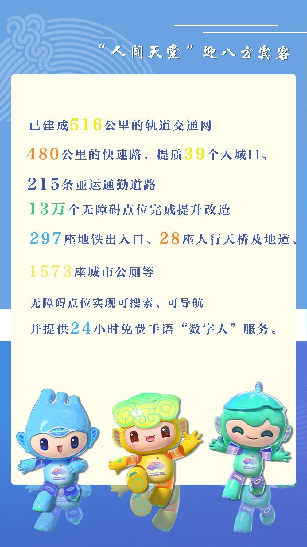 目前,杭州亞運會、亞殘運會56個競賽場館、31個訓練場館已全部竣工,并完成賽事功能驗收,亞運村和5個亞運分村準備就緒,具備入住條件。以周全準備回應熱切期盼,用真摯笑臉迎接八方賓客。
