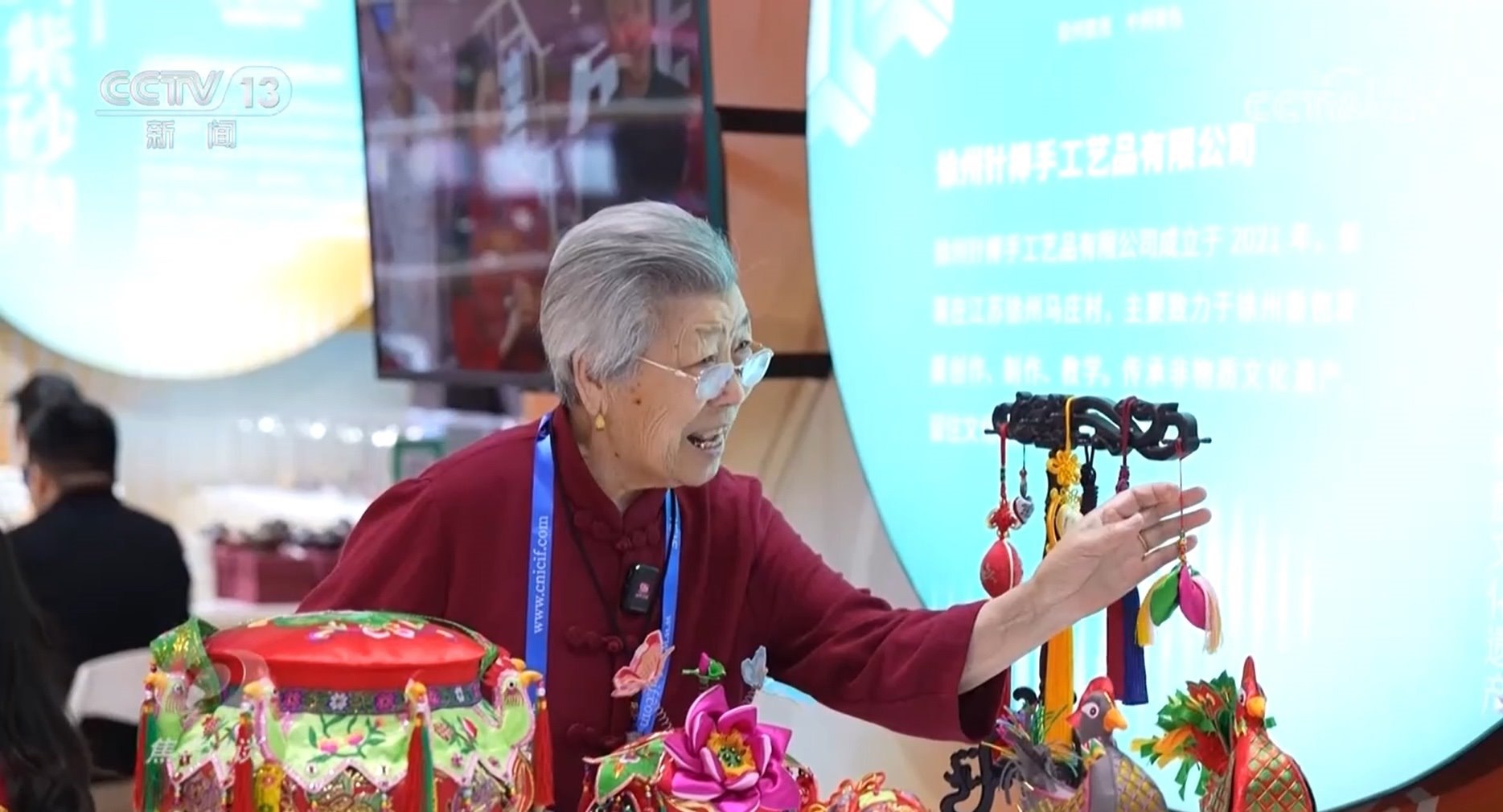 在江蘇展區(qū),一位正在做針線活的白發(fā)老人引人注目,她是江蘇省級非遺項目傳承人王秀英。王奶奶做的徐州香包名字叫作“針棒”,有著豐厚的文化蘊涵和文化價值,入選第一批國家級非物質(zhì)文化遺產(chǎn)擴展項目名錄。這次和王奶奶一同來參展的還有她的孫女孫歌堯。在學(xué)習(xí)傳統(tǒng)工藝的同時,孫歌堯大膽創(chuàng)新,嘗試融入更多技法和材質(zhì)。