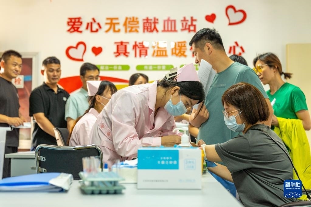 6月14日,山東省青州市志愿者在街頭一處獻(xiàn)血屋參與無(wú)償獻(xiàn)血。   新華社發(fā)(王繼林?jǐn)z)