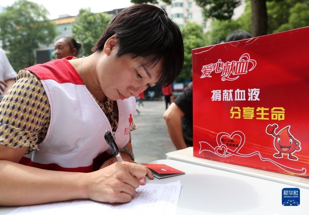 6月14日,志愿者在重慶市黔江區(qū)獻(xiàn)血愛(ài)心屋填寫(xiě)無(wú)償獻(xiàn)血信息。   新華社發(fā)(楊敏攝)