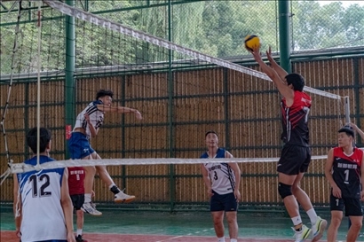 6月10日,在四川省第三屆“貢嘎杯”青少年校園體育聯(lián)賽總決賽排球賽中,升庵中學(xué)排球隊(duì)隊(duì)員(左)在攔網(wǎng)。新華社記者唐文豪攝