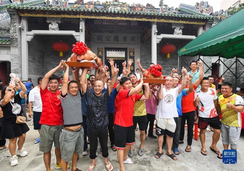 6月15日,2023年車(chē)陂龍舟競(jìng)渡第一名“范陽(yáng)簡(jiǎn)”龍船會(huì)的成員們?cè)诩异羟疤е?jiǎng)品燒豬慶祝。