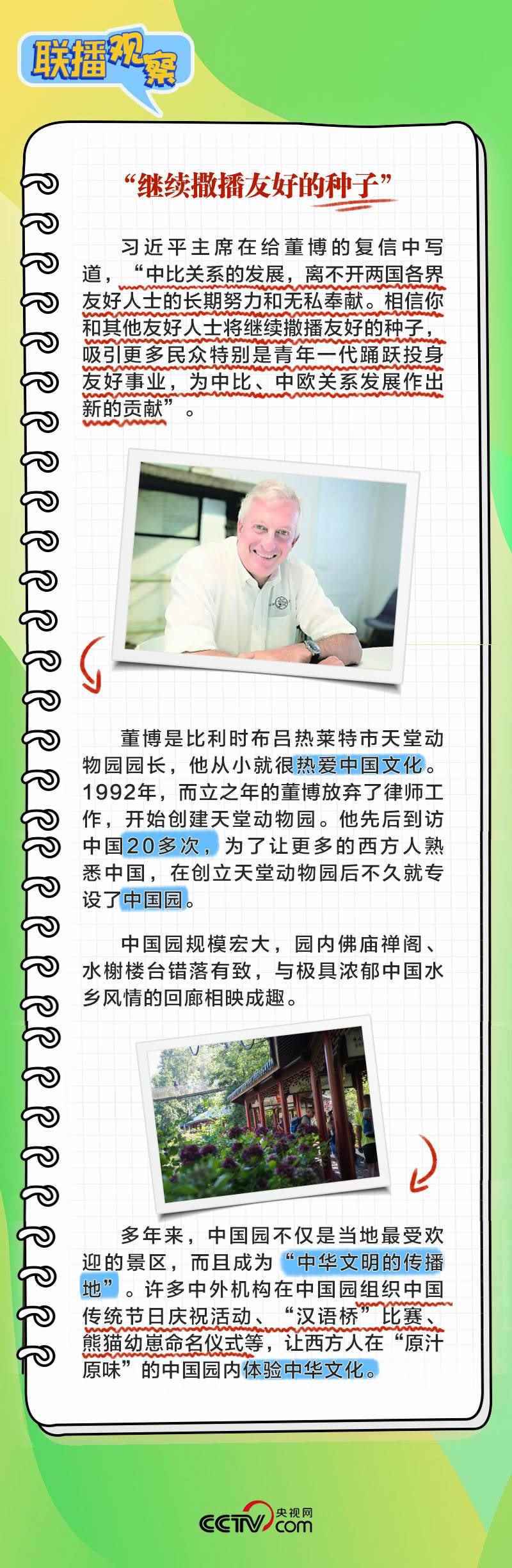 董博是比利時(shí)布呂熱萊特市天堂動(dòng)物園園長(zhǎng),他在給習(xí)主席致信中回顧了習(xí)主席和夫人彭麗媛2014年3月訪(fǎng)比期間出席天堂動(dòng)物園大熊貓園開(kāi)園儀式的情景,表示中國(guó)園體現(xiàn)人與自然和諧共生理念,中國(guó)夢(mèng)和中國(guó)的發(fā)展繁榮永遠(yuǎn)是可共享的機(jī)遇。