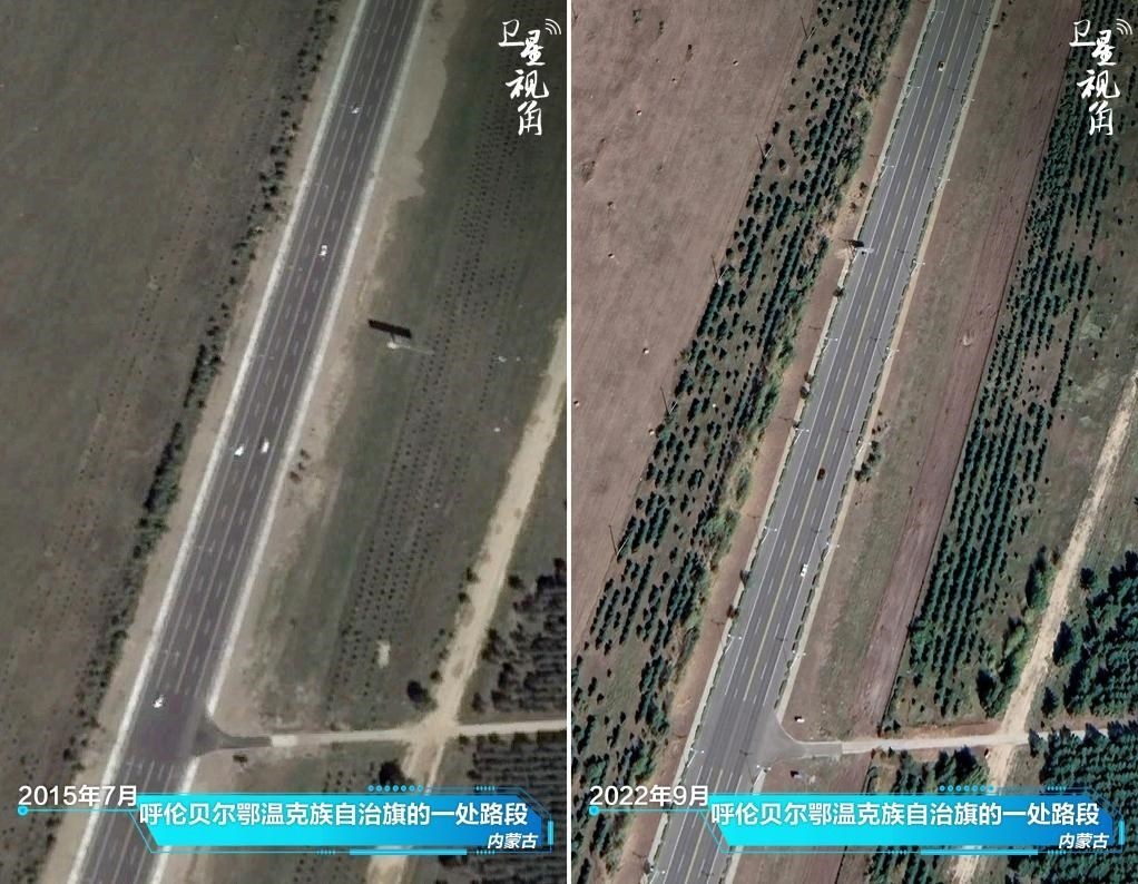 ↑2022年與2015年相比,內(nèi)蒙古呼倫貝爾鄂溫克族自治旗一處道路兩側樹木顯著增多。