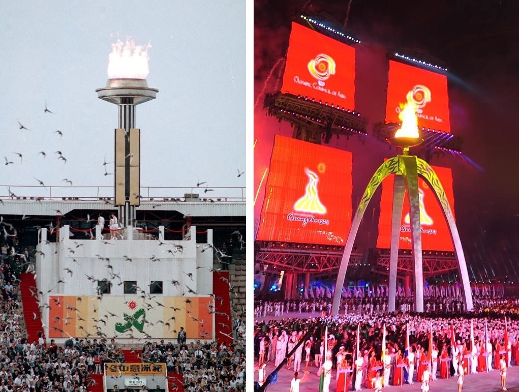 左圖:1990年9月22日,第十一屆亞運(yùn)會開幕式在北京工人體育場舉行。