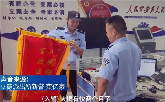 9月5日,安徽亳州。立德派出所新警龔億豪幫助轄區(qū)群眾找回失物,收到群眾送來的錦旗后,龔億豪開心地向同事“炫耀”,秒變“顯眼包”。