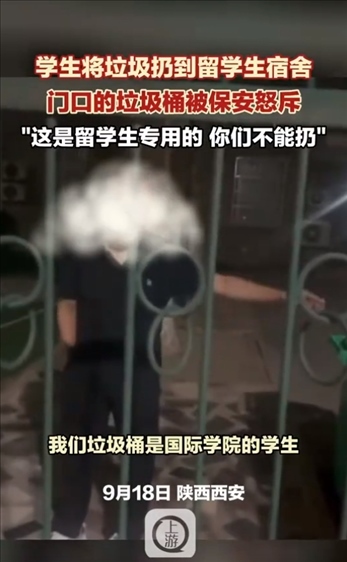 ·西安交大學(xué)生用留學(xué)生宿舍垃圾桶遭保安怒斥,學(xué)?;貞?yīng):會(huì)對(duì)相關(guān)人員進(jìn)行批評(píng)教育。