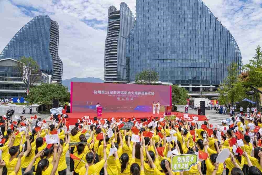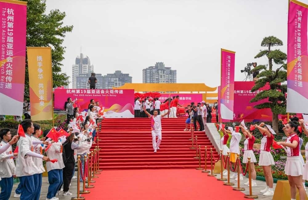 ↑這是杭州亞運(yùn)會(huì)火炬?zhèn)鬟f杭州站起跑儀式現(xiàn)場。