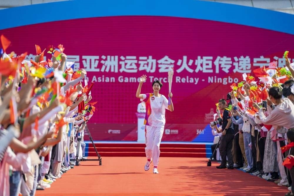 ↑這是杭州亞運(yùn)會(huì)火炬?zhèn)鬟f寧波站收火儀式現(xiàn)場。