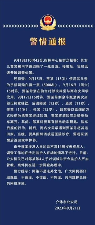 ·13歲女孩被4名未成年人逼喝白酒?山西介休警方通報(bào):4人被訓(xùn)誡。