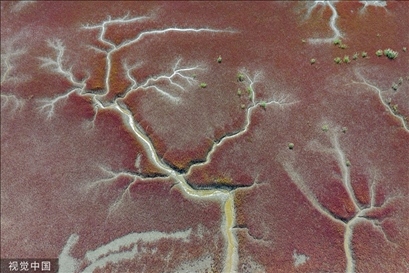 遼寧盤(pán)錦,大洼區(qū)紅海灘的潮溝與堿蓬草編織成一幅迷人圖案。