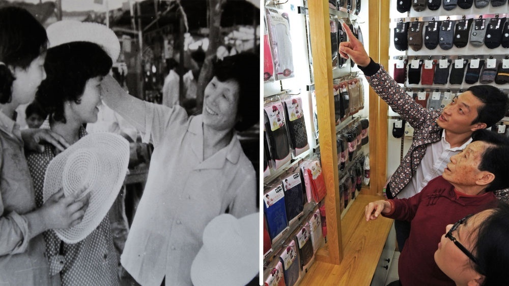 ↑拼版照片,左圖為:義烏小商品市場(chǎng)第一代經(jīng)營(yíng)戶馮愛(ài)倩(右)在向顧客推銷遮陽(yáng)帽(攝于上個(gè)世紀(jì)80年代);右圖為:2018年10月25日,78歲的馮愛(ài)倩(中)在傾聽(tīng)她的孫子、義烏國(guó)際商貿(mào)城經(jīng)營(yíng)戶楊帆(上)介紹他自產(chǎn)自銷的新款襪子。楊帆大學(xué)畢業(yè)后當(dāng)上了父親創(chuàng)辦的襪業(yè)公司的總經(jīng)理。
