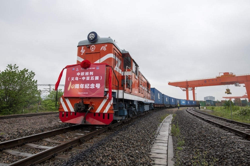 ↑2023年4月23日在義烏西站拍攝的“義烏-中亞五國(guó)10周年紀(jì)念號(hào)”中歐班列。