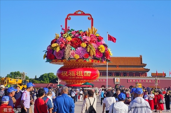2023年9月22日上午,北京,“祝福祖國”巨型花籃在天安門廣場亮相。