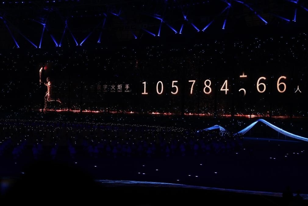 9月23日,數(shù)字火炬手在開幕式上進(jìn)行火炬?zhèn)鬟f。新華社記者朱崢攝