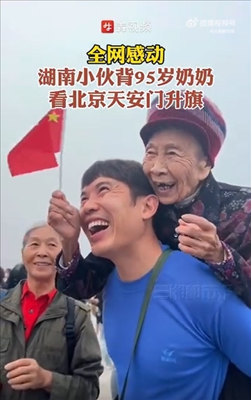 近日,湖南一名男子背著95歲的奶奶,從永州出發(fā)到北京天安門(mén)看升國(guó)旗??粗逍羌t旗冉冉升起,祖孫兩人露出了幸福的笑容。網(wǎng)友:這是“最美的風(fēng)景”。