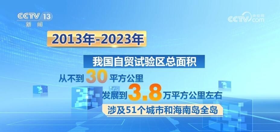 十年間,我國自貿試驗區(qū)的總面積從不到30平方公里發(fā)展到3.8萬平方公里左右,涉及51個城市和海南島全島。今年上半年,我國自貿試驗區(qū)以不到千分之四的國土面積,實現(xiàn)了占全國18.4%的外商投資和18.6%的進出口總額,帶動全國形成了覆蓋東西南北中、統(tǒng)籌沿海內陸沿邊的改革開放創(chuàng)新格局。