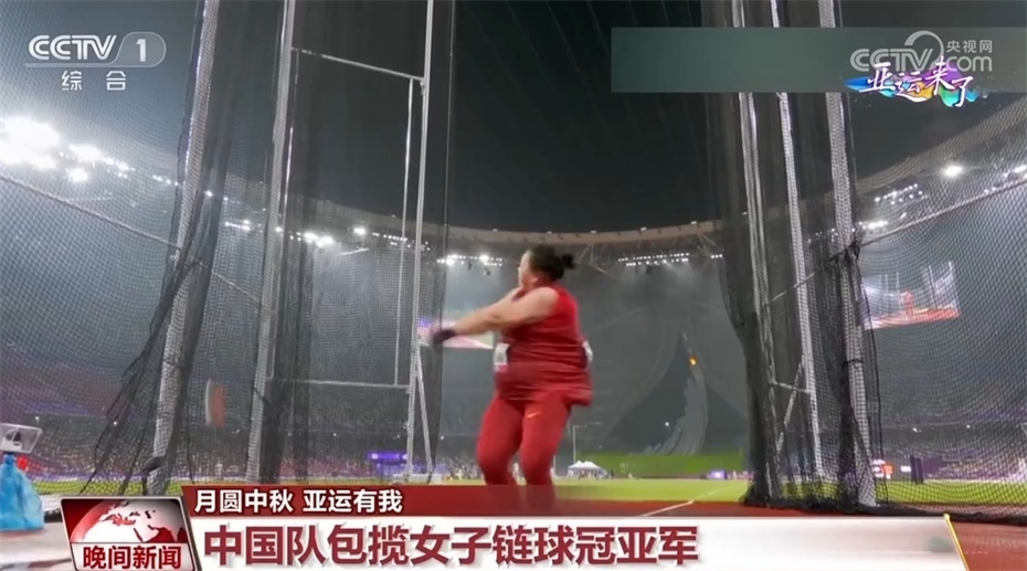 9月29日晚的田徑賽場(chǎng),女子鏈球決賽中,中國(guó)隊(duì)35歲老將王崢以71米53的成績(jī)獲得冠軍,趙杰獲得亞軍。