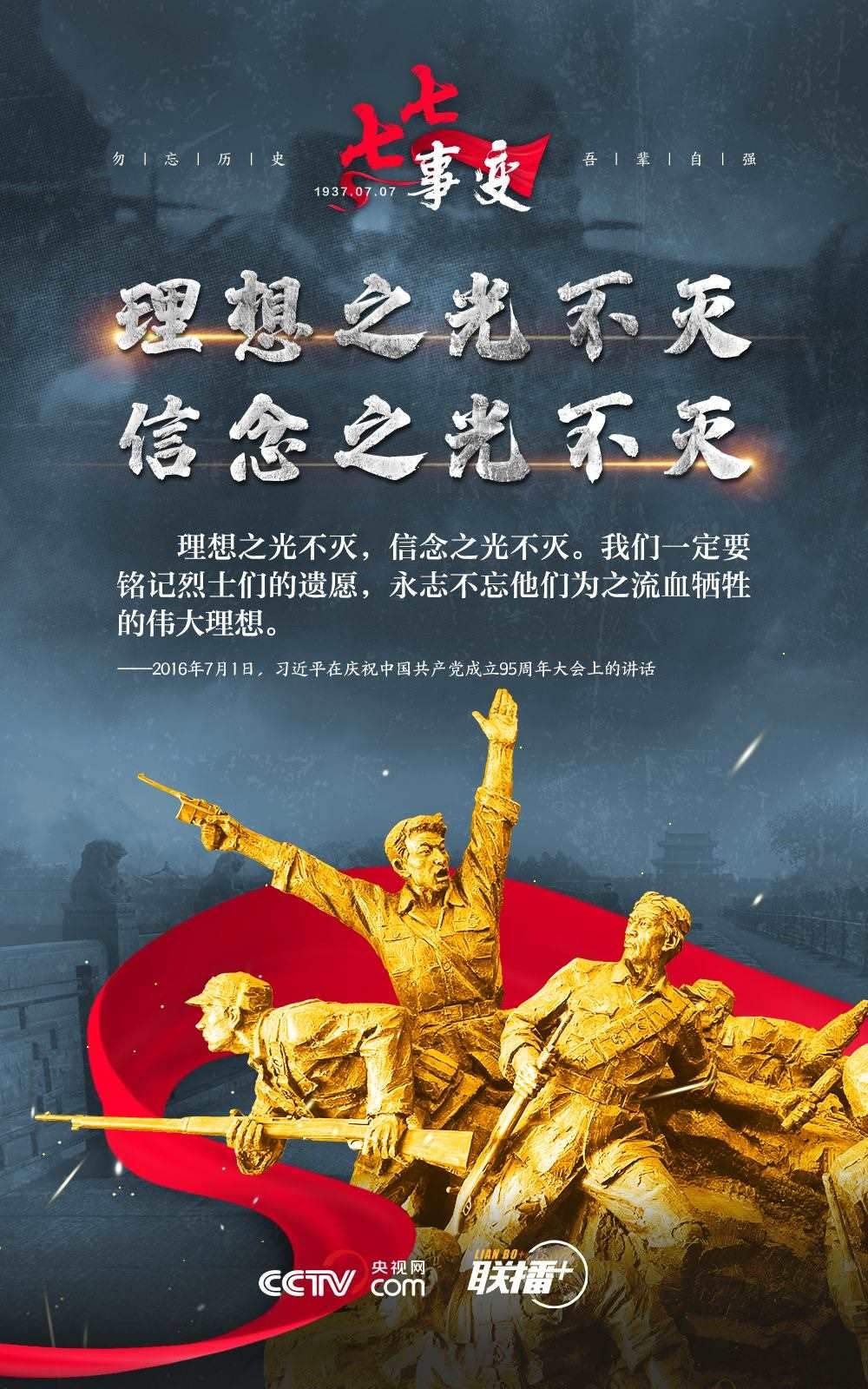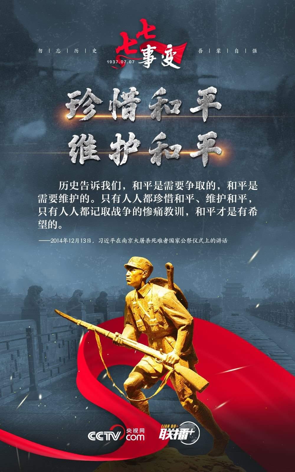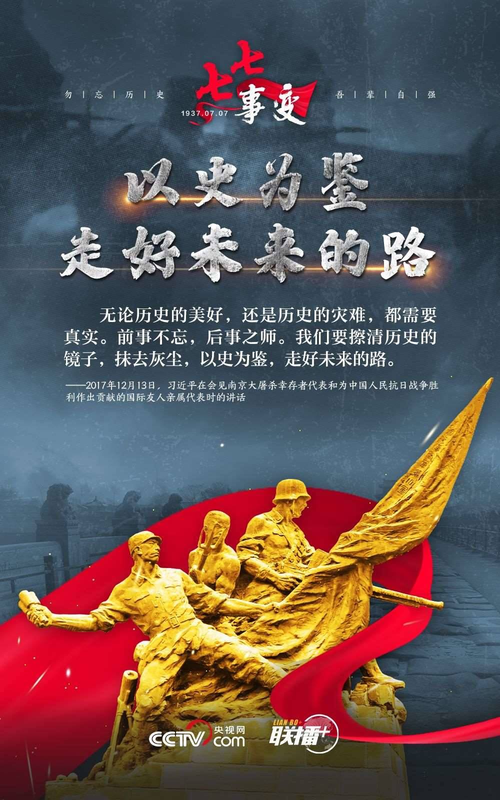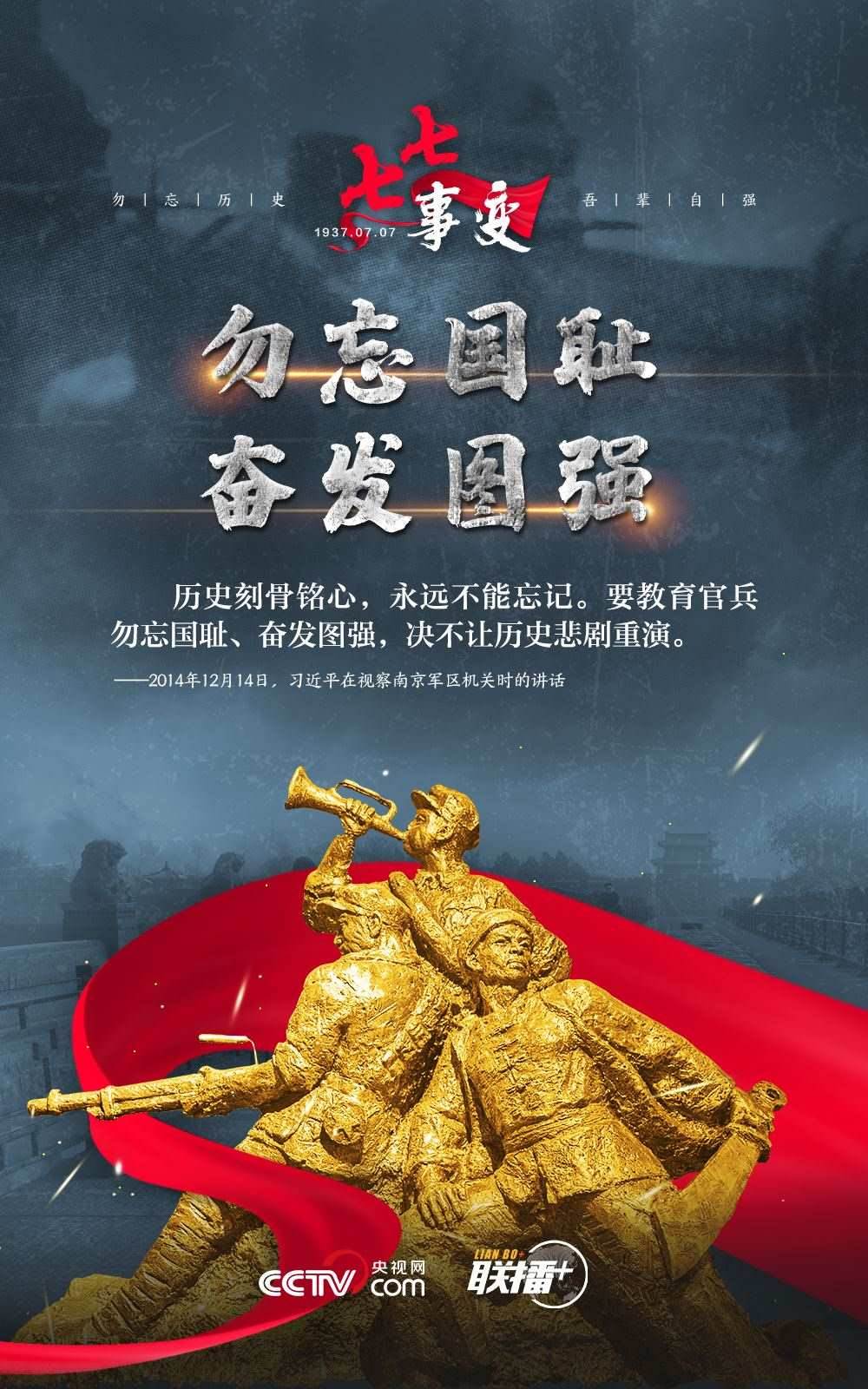 悼念同胞,緬懷先烈。勿忘歷史,吾輩自強!在“七七事變”86周年之際,央視網(wǎng)《聯(lián)播+》欄目特推出海報,與您一起從總書記講話中汲取自強不息的奮進(jìn)力量。