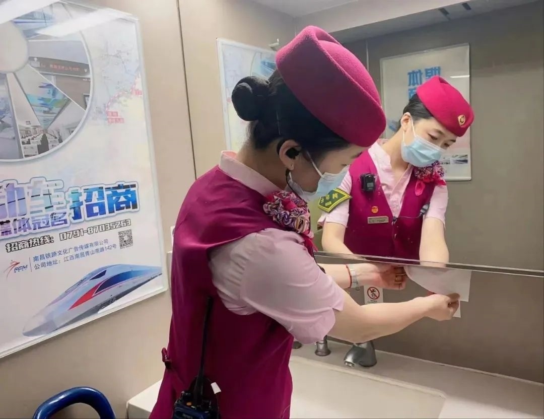 除了車身硬件的“美妝”,在列車上線始發(fā)前,列車乘務(wù)人員還要檢查各類客運(yùn)服務(wù)備品、衛(wèi)生備品等是否準(zhǔn)備齊全。他們需要保證車座椅背后網(wǎng)兜清潔袋擺放整齊,小桌板統(tǒng)一收起,頭枕巾和椅套擺放平整、干凈、無(wú)污染。