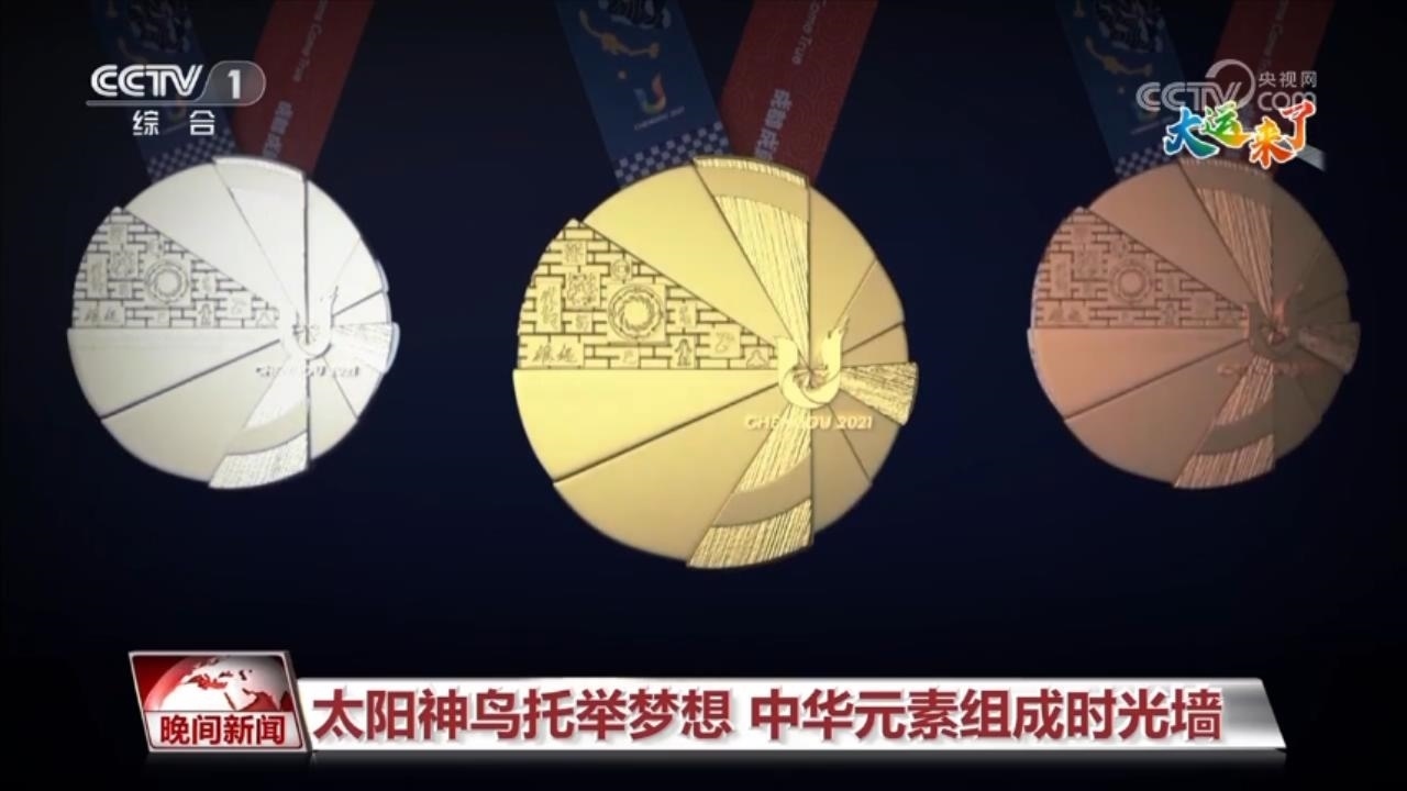再來看圖案。獎(jiǎng)牌正面設(shè)計(jì)賦予“太陽神鳥”羽翼幾何感,與賽會(huì)會(huì)徽“U”呼應(yīng),猶如神鳥,振翅欲飛,寓意守護(hù)夢想,自信昂揚(yáng),飛往多彩未來。同時(shí),在幾何扇面嵌入一塊包含多種中華文明代表元素為底紋的絢麗時(shí)光墻,以呈現(xiàn)中國五千年文明的璀璨輝煌和演變歷史。