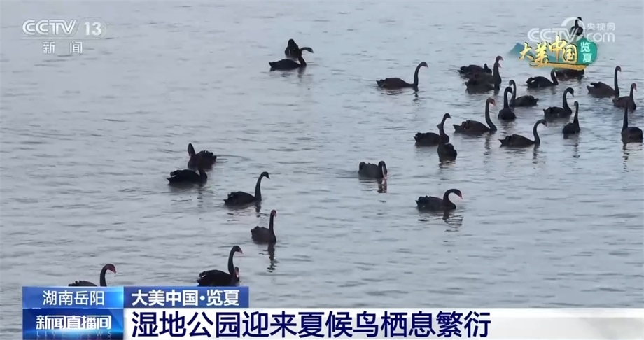 時(shí)值盛夏,湖南岳陽(yáng)湘陰的洋沙湖-東湖國(guó)家濕地公園引來(lái)大批夏候鳥來(lái)此棲息繁衍。碧波蕩漾、清荷搖曳,黑天鵝在此嬉戲覓食,麋鹿閑庭信步、悠然自得。