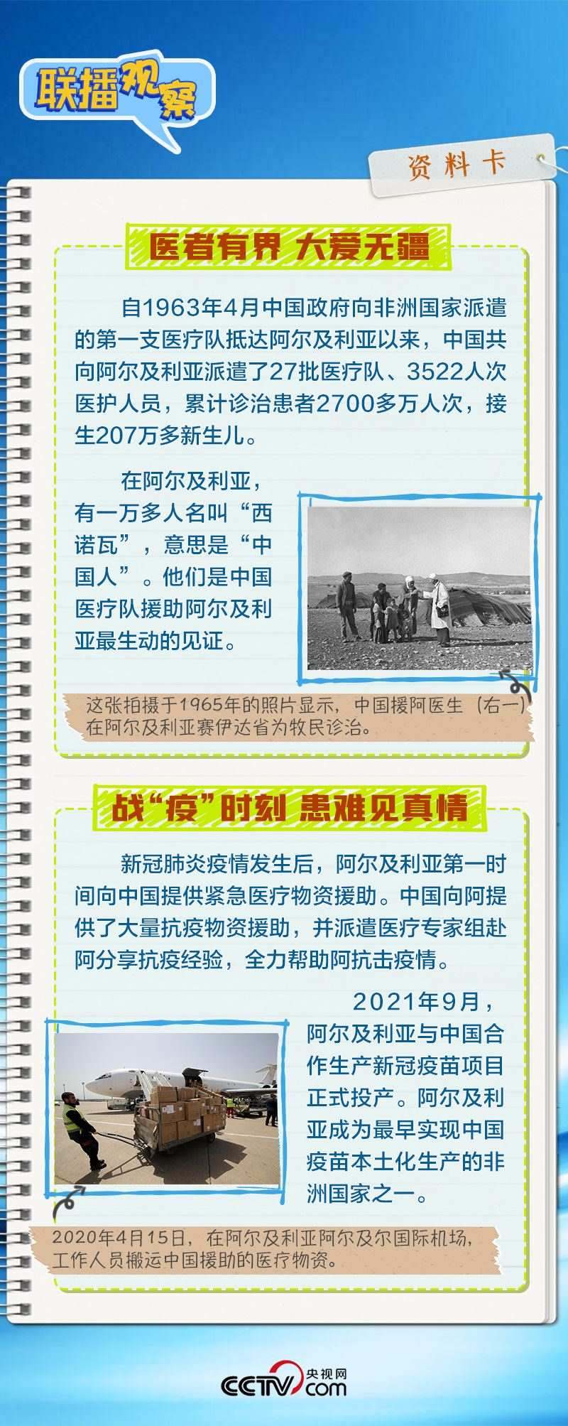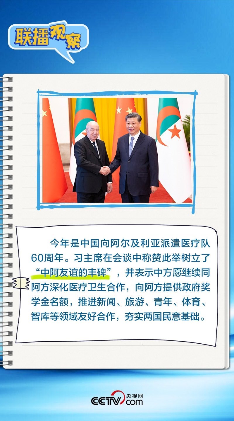 會談中,習(xí)主席特別提到,今年是中國向阿爾及利亞派遣醫(yī)療隊(duì)60周年,并稱贊此舉樹立了“中阿友誼的豐碑”。中阿傳統(tǒng)友誼深厚,兩國始終相互尊重、平等相待、彼此支持,締造了一段段友好交往的佳話。