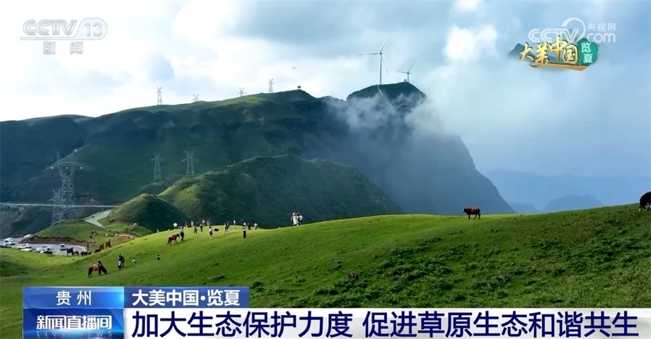 跟隨鏡頭,我們來(lái)到貴州六盤水盤州市的烏蒙大草原。眼下,正值盛夏的烏蒙大草原水草豐茂、碧綠如茵、牛羊成群,從空中俯瞰,縹緲的云霧將草原裝扮得十分夢(mèng)幻。烏蒙大草原最高海拔2857米。因?yàn)榈靥幐吆0蔚貐^(qū),這里的氣候適宜,吸引了許多游客來(lái)到這里避暑旅游。近年來(lái),當(dāng)?shù)丶哟髮?duì)村民和游客的宣傳引導(dǎo)力度,并采取措施限制過(guò)度放牧,嚴(yán)厲打擊采挖野生高原矮杜鵑和駕車碾壓草地等行為,保護(hù)草原生態(tài)平衡,維護(hù)生物多樣性,讓烏蒙大草原生態(tài)持續(xù)向好,實(shí)現(xiàn)人與自然和諧共生。