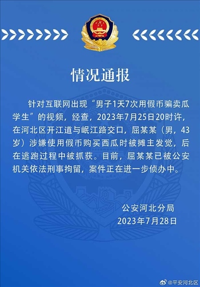 ·男子1天7次用假幣騙賣瓜學(xué)生?天津警方通報。