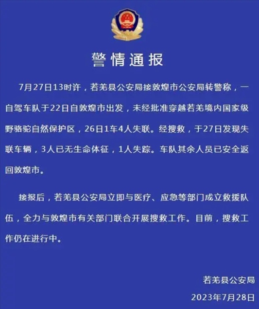 ·新疆若羌縣警方通報一車隊未經(jīng)批準(zhǔn)穿越自然保護區(qū):3人無生命體征,1人失蹤。