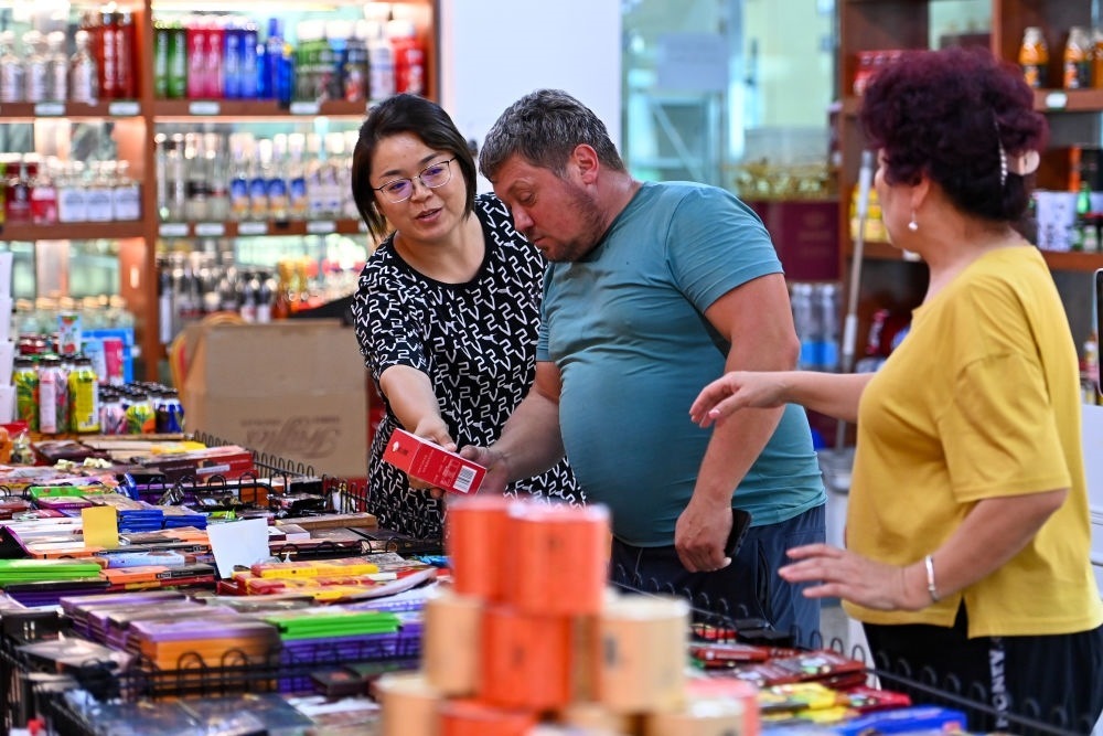 在新疆塔城巴克圖中哈邊民互市絲路文化商品城,一位哈薩克斯坦的游客在選購(gòu)商品(7月22日攝)。新華社記者丁磊 攝