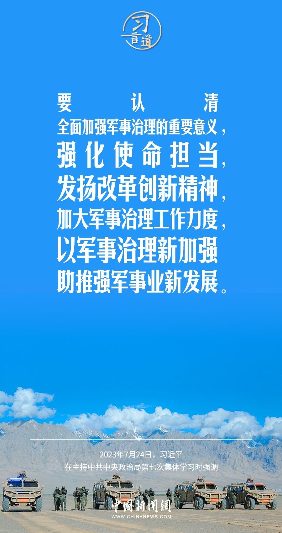 八一建軍節(jié)來臨之際,中共中央政治局7月24日下午就全面加強(qiáng)軍事治理進(jìn)行第七次集體學(xué)習(xí)。中共中央總書記習(xí)近平主持學(xué)習(xí),他強(qiáng)調(diào)——