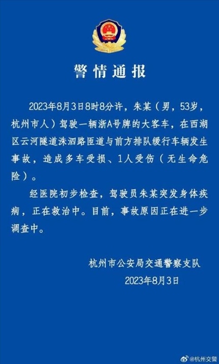 ·杭州警方通報大客車隧道與多車相撞:客車駕駛員突發(fā)疾病。