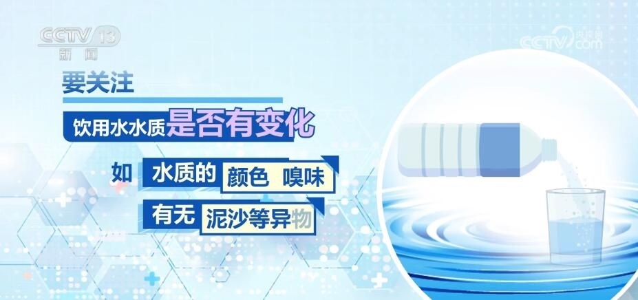 要關注飲用水水質(zhì)是否有變化,如水質(zhì)的顏色、嗅味,有無泥沙等異物,如有異常,切勿飲用。